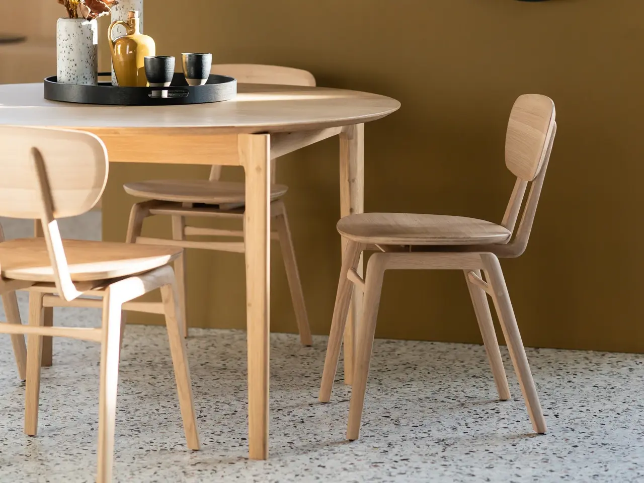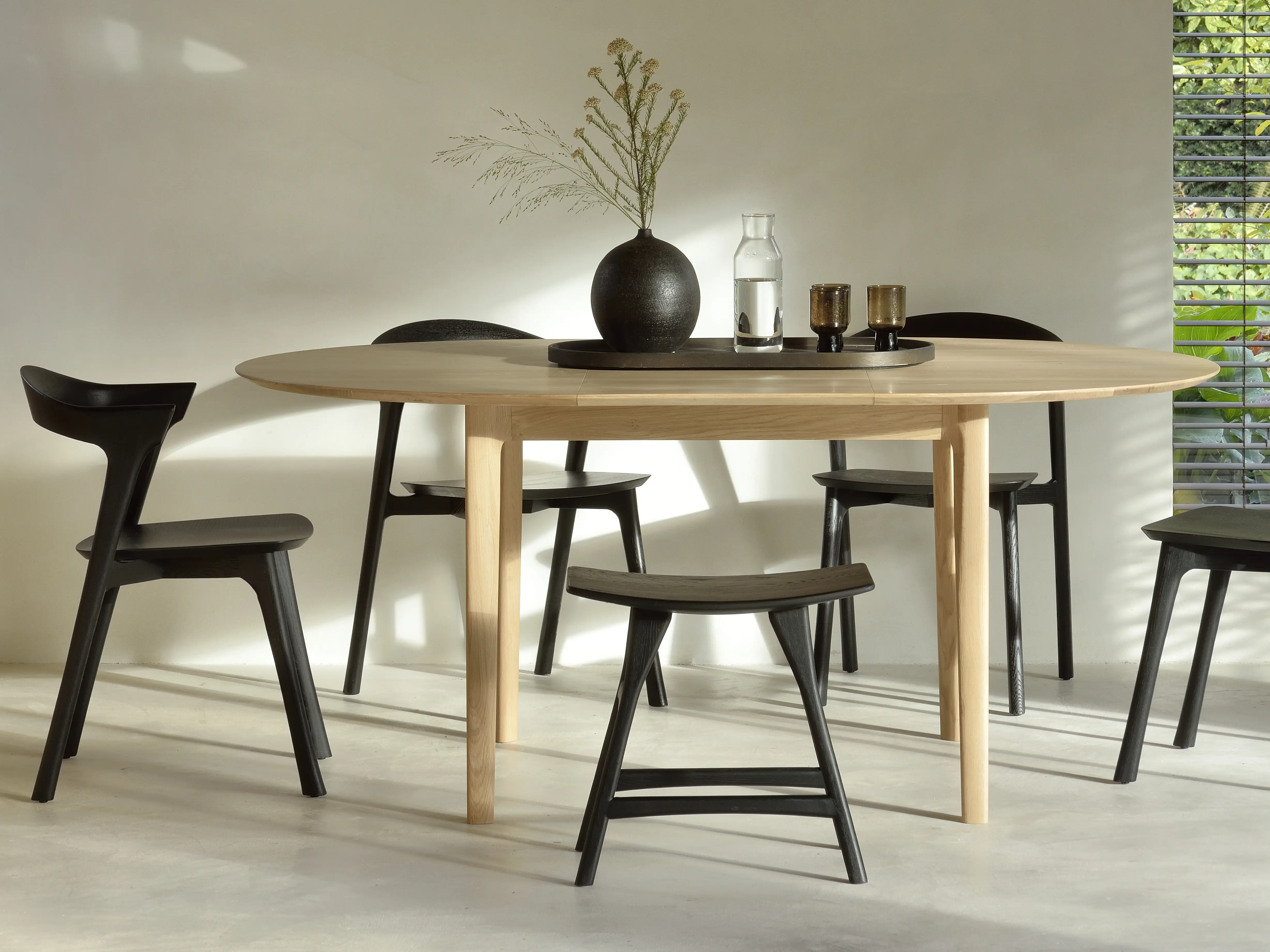 The Bok solid oak round extendable dining table offers the perfect solution for adaptable dining within a smaller space. With an internally housed extension the round four-seater easily adapts for more people. The Bok's iconic airy shape and solid construction make for a timeless design to enjoy for years to come.