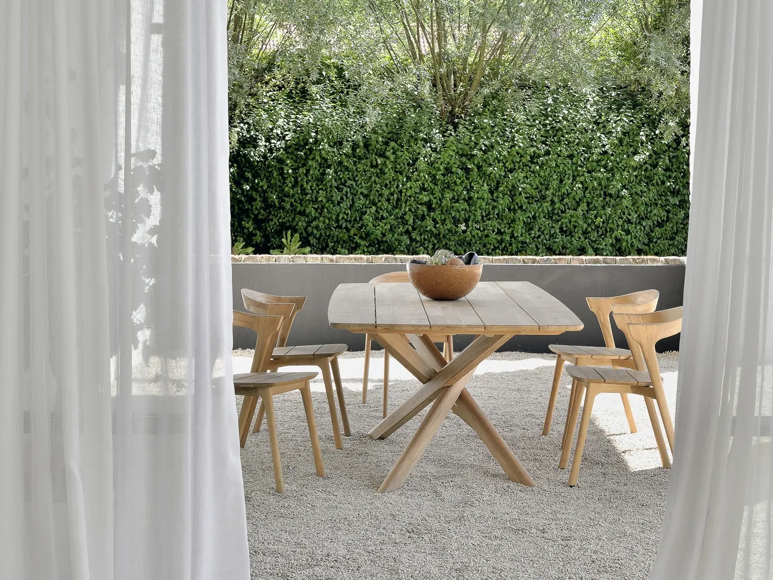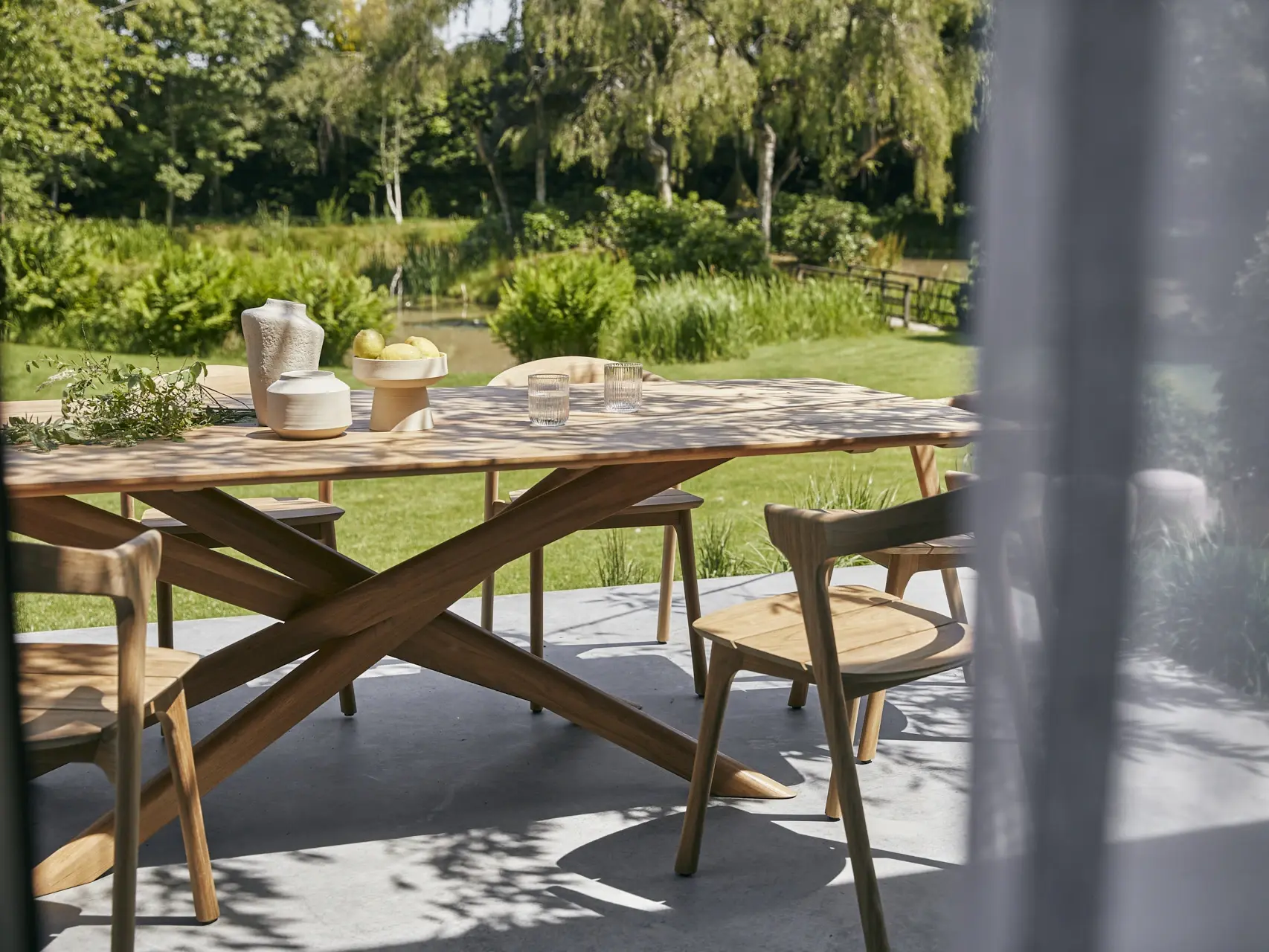 The Mikado dining table, designed by Alain van Havre, has been one of our most recognisable designs for years. Its sculptural character is the result of a quest to find a balance between functionality and stability. Mikado’s legs interlock like a well-thought-out puzzle, while the adapted grooved table top in solid teak makes outdoor life a simple pleasure.