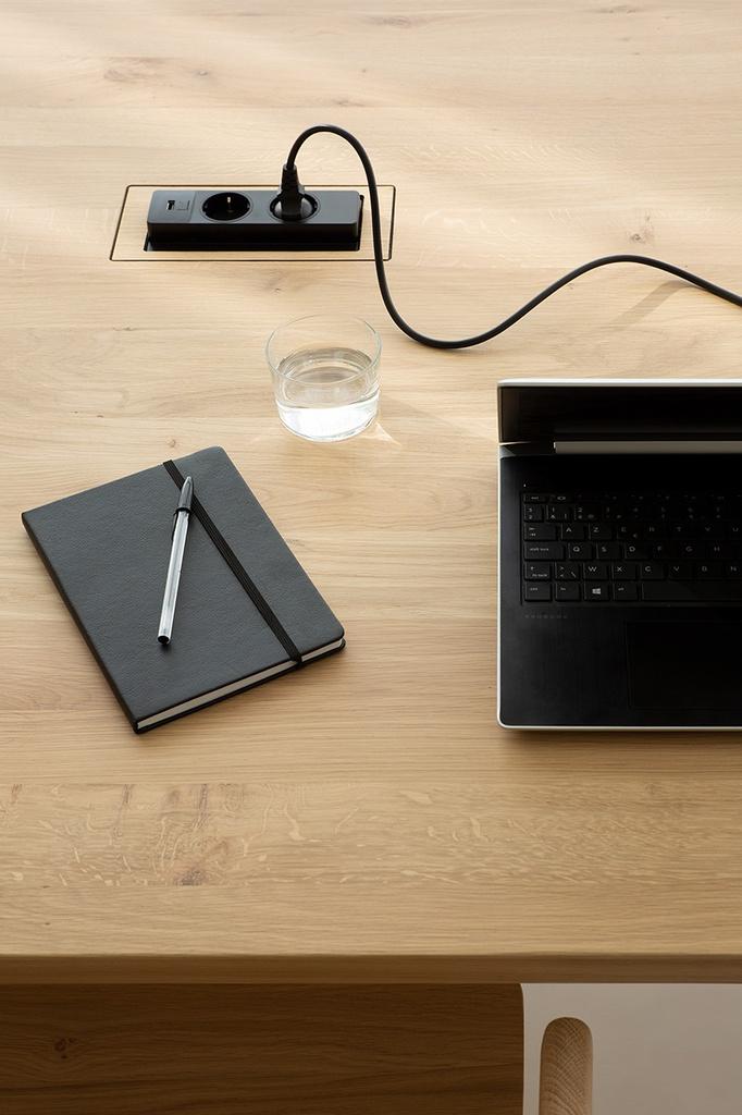 Het Bok coworking bureau van Alain van Havre past perfect in een coworking ruimte. Dankzij het bredere ontwerp kunnen twee mensen tegenover elkaar zitten met genoeg ruimte voor beiden. Drie sets stopcontacten zijn geïntegreerd in het ontwerp. Als je klaar bent, kun je de stopcontacten terug in de tafel tikken - gelijk met het strakke oppervlak.