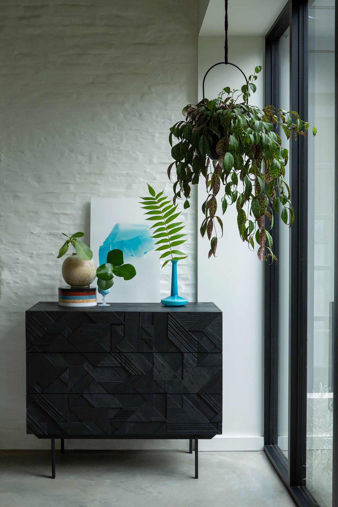 Made from black-tainted solid teak with a varnish finish and black metal legs.