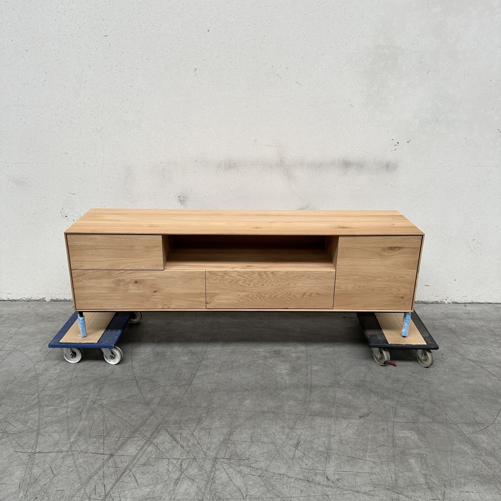 The Whitebird TV cupboard features 1 push open door, 1 flip-down door and 2 push open drawers.