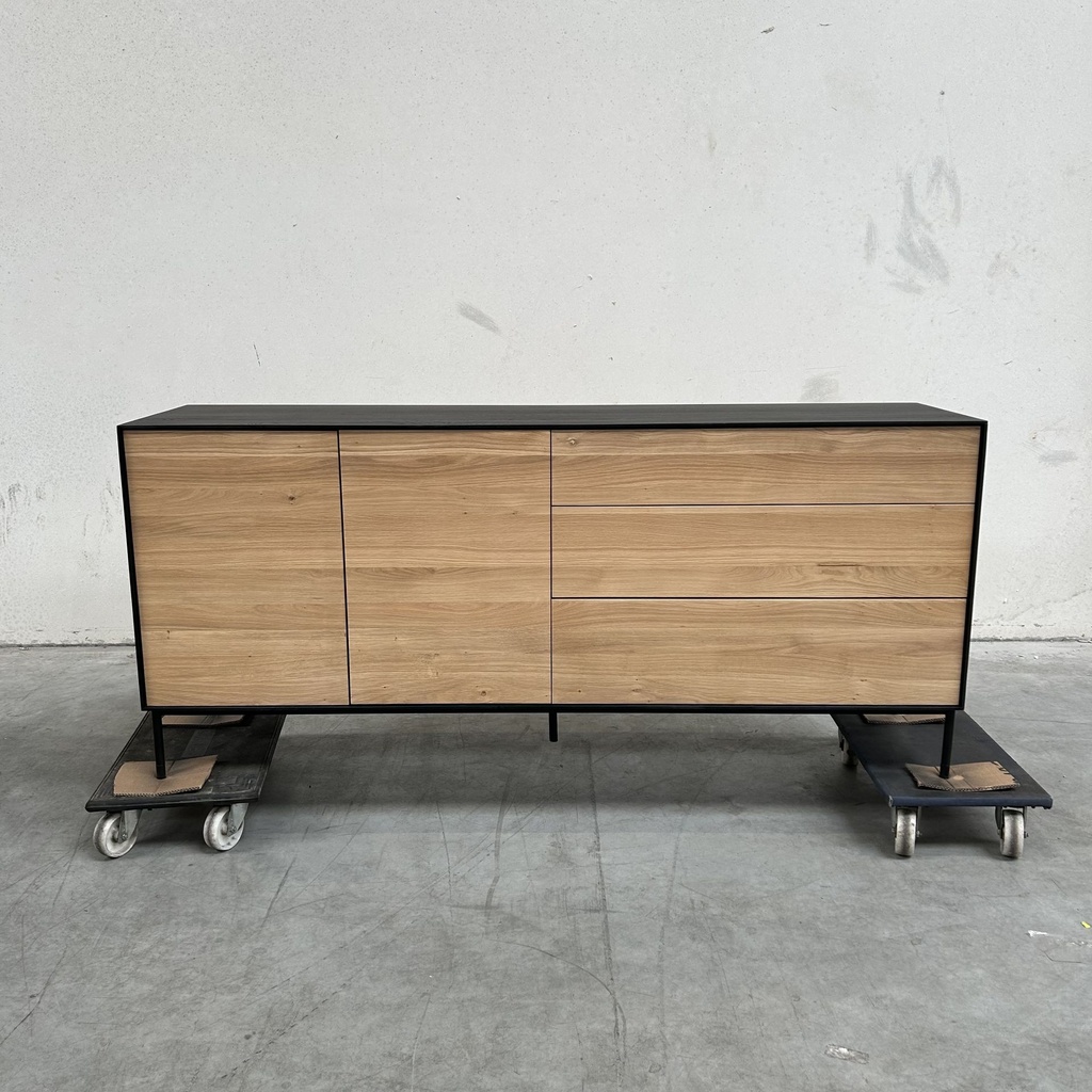 This Blackbird sideboard features 2 push open doors and 3 push open drawers.