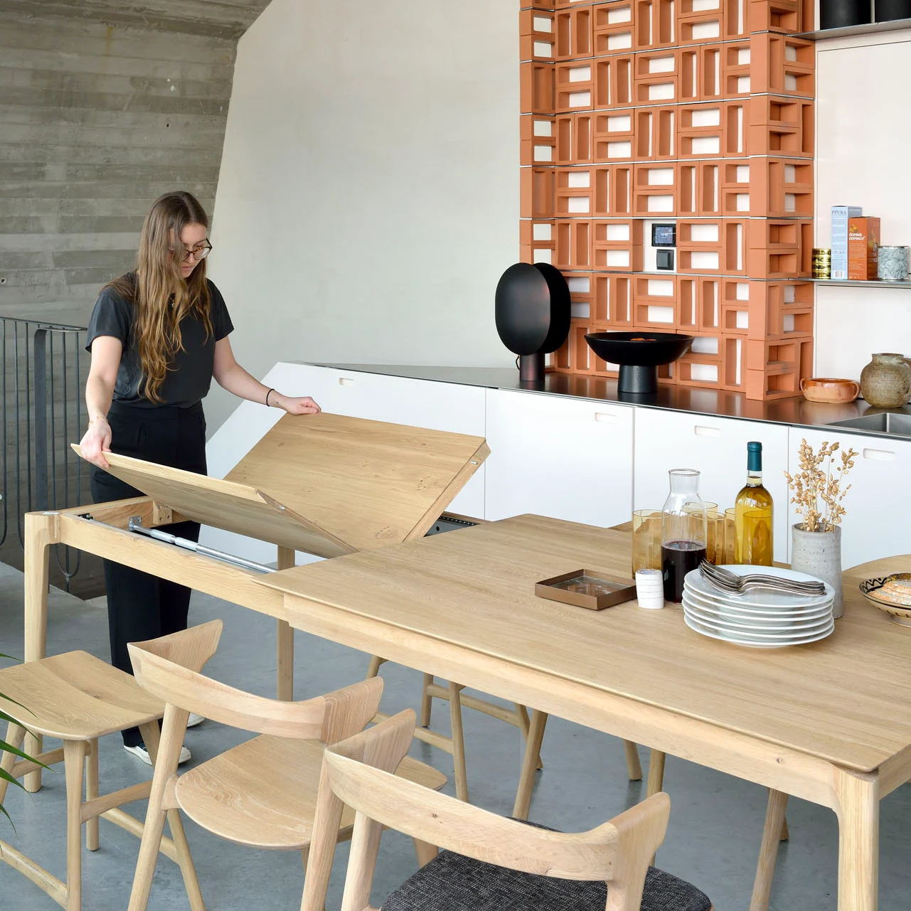 The signature Bok table by Ethnicraft was made extendable to bring even more people together. Its airy shape yet rock solid construction make this solid oak extendible dining table a timeless and remarkable design to enjoy for years to come.