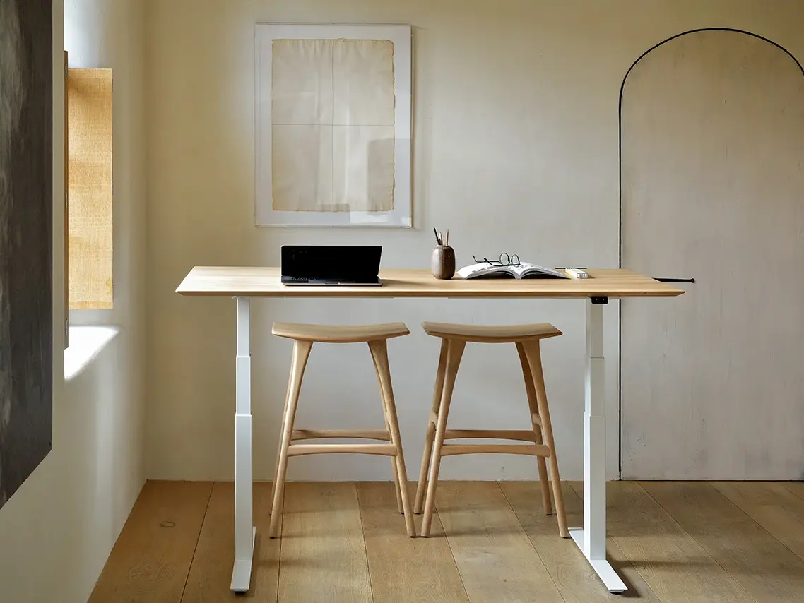 With the importance of health and good posture in mind, Alain van Havre developed the Bok adjustable desk by Ethnicraft. The motorized system in its legs allows the tabletop to be elevated to the height of your liking. That way, you can easily switch between sitting and standing throughout the workday. Choose between white or black metal legs.