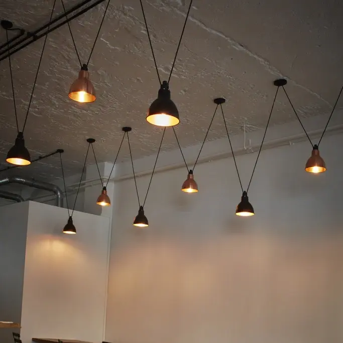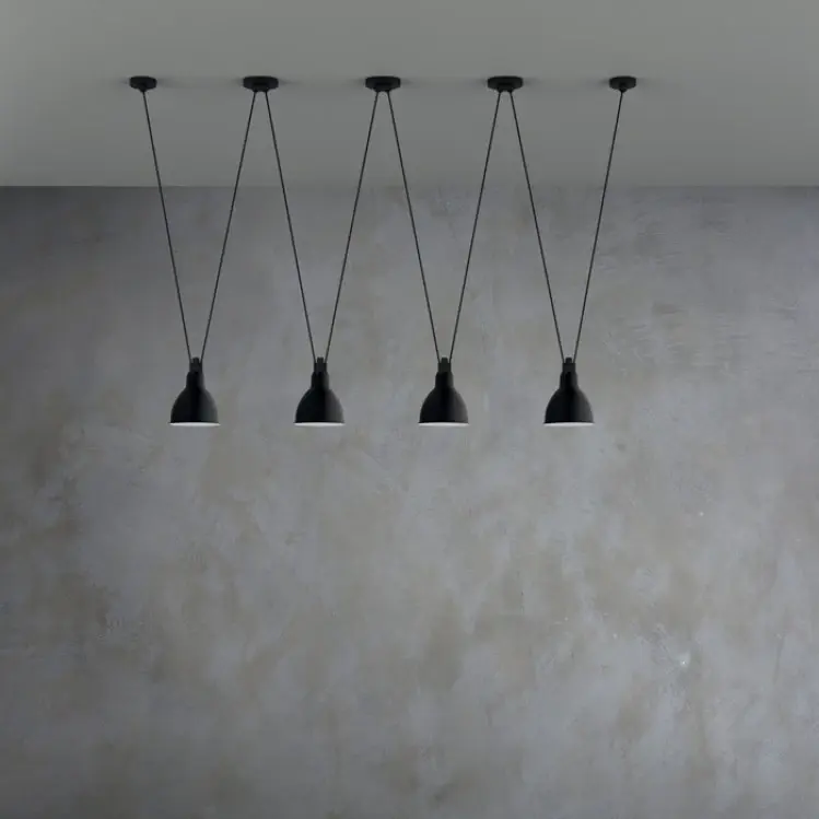 The 324 ceiling lamp Black by Lampe Gras is a fascinating interpretation of a pendant lamp. The lamp does not hang from the ceiling by a traditional wire, but rather by its own wire, like an acrobat.