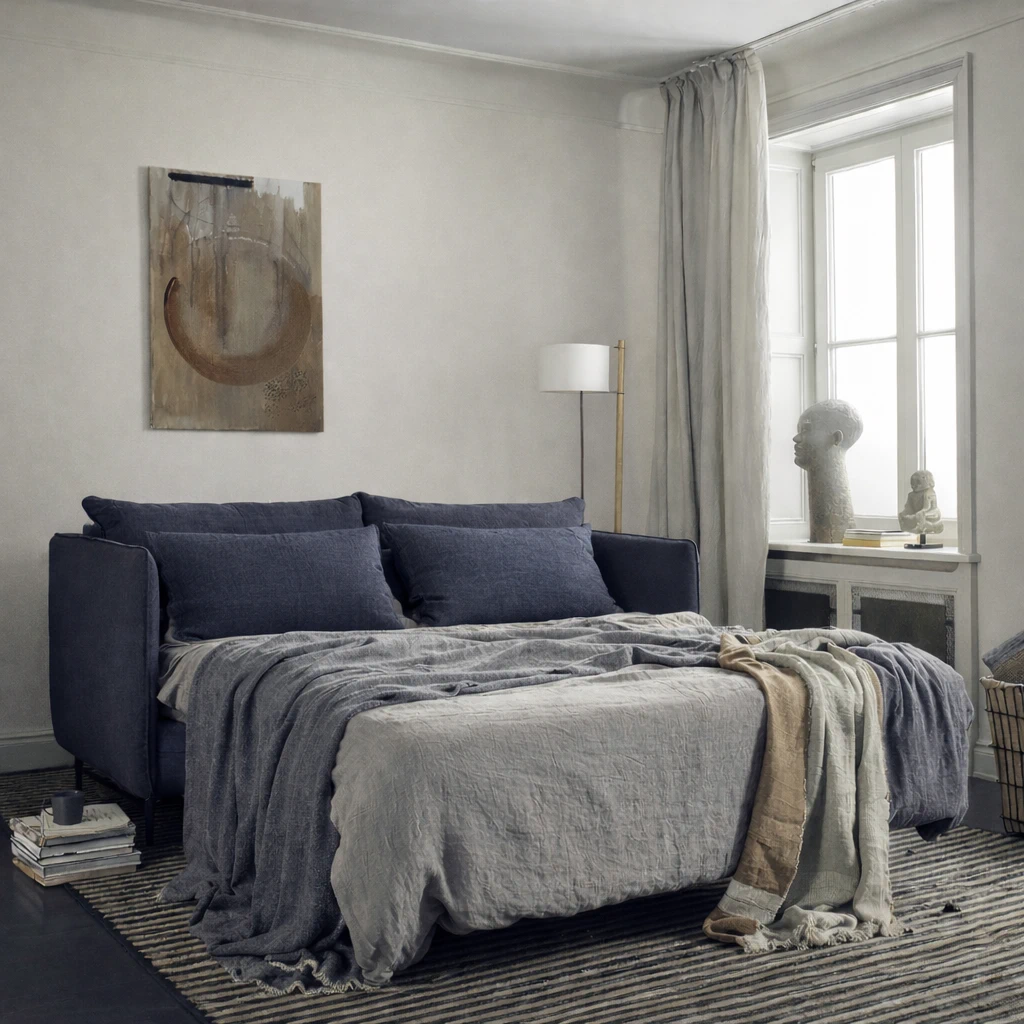 The seat is filled with high-elasticity foam for supportive comfort, while the back cushions combine feathers and silicone balls for a soft, inviting feel. Slim metal legs lend the sofa a light, discreet profile, enhancing its contemporary character. When unfolded, the cushions can be arranged to act as a comfortable headboard, adding an extra layer of ease for sleeping.