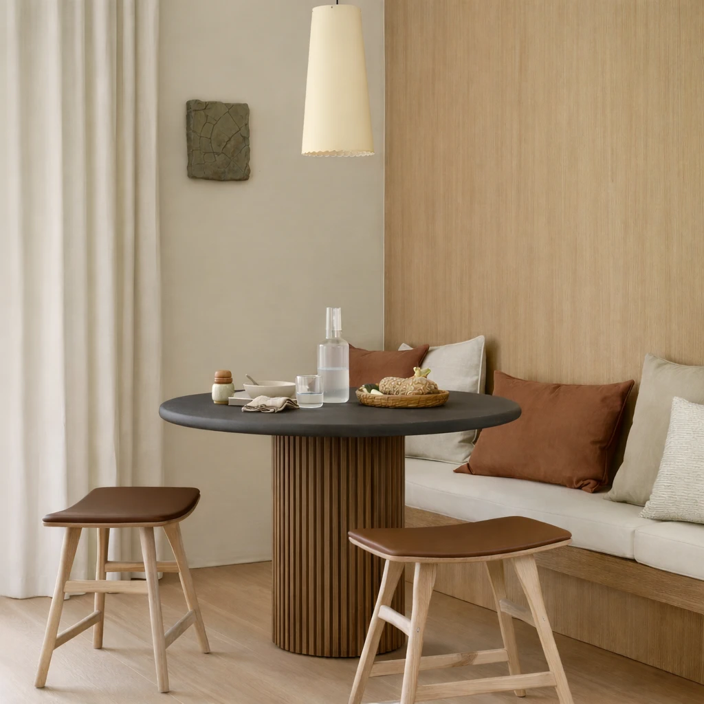 • The Roller Max collection by Ethnicraft is remarkable in its design, distinguished with its stacked wood-stick effect. This dining table melds form with function in a natural and timeless way. Featuring a hand-finished concrete top, paired with a reclaimed solid teak base, a beautiful material mix provides durable practicality to indoor spaces.