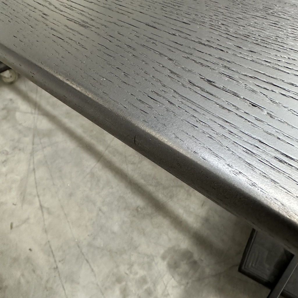Made from black tainted oak with a brushed and varnished finish, on a black metal base.