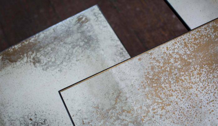 This square Surface coffee table by Ethnicraft has a black metal structure with a 'Heavy Aged' mirror tabletop in a metallic bronze tone that creates a unique look.